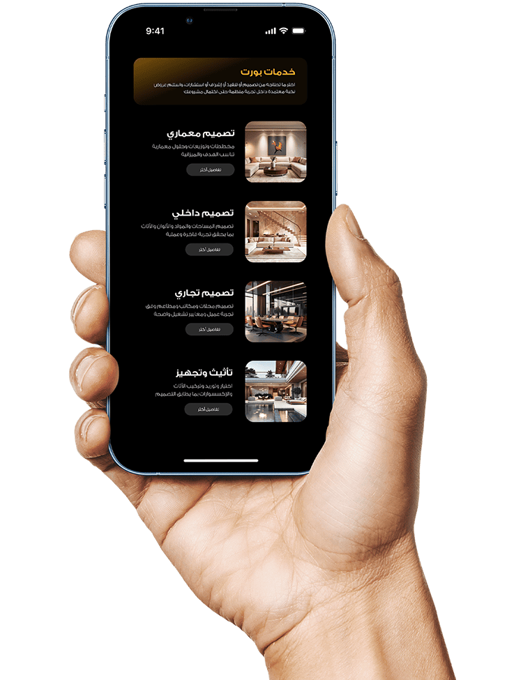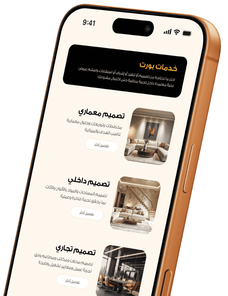 بورت هي منصة رقمية فاخرة تجمع نخبة المصممين والمنفذين المعتمدين، لتمنحك تجربة متكاملة لإدارة مشروعك من الفكرة حتى التسليم، بعقود رقمية ذكية، دفعات آمنة، ومتابعة احترافية بمعايير عالية الجودة.